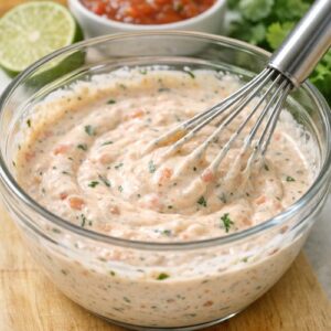 - In a medium bowl, whisk together 1 cup sour cream, 1 cup ranch dressing, ½ cup salsa, juice from half your lime, and a pinch of cilantro if using. Make this 15 minutes before assembly so the flavors have time to meld. Taste and adjust seasoning—you want it slightly brighter than the ranch alone but still creamy and mild. This mixture holds beautifully for the entire week and actually tastes better after a day of flavors settling. Transfer this to a separate container and refrigerate until assembly time. This prevents you from having to make this component later and ensures maximum flavor development.